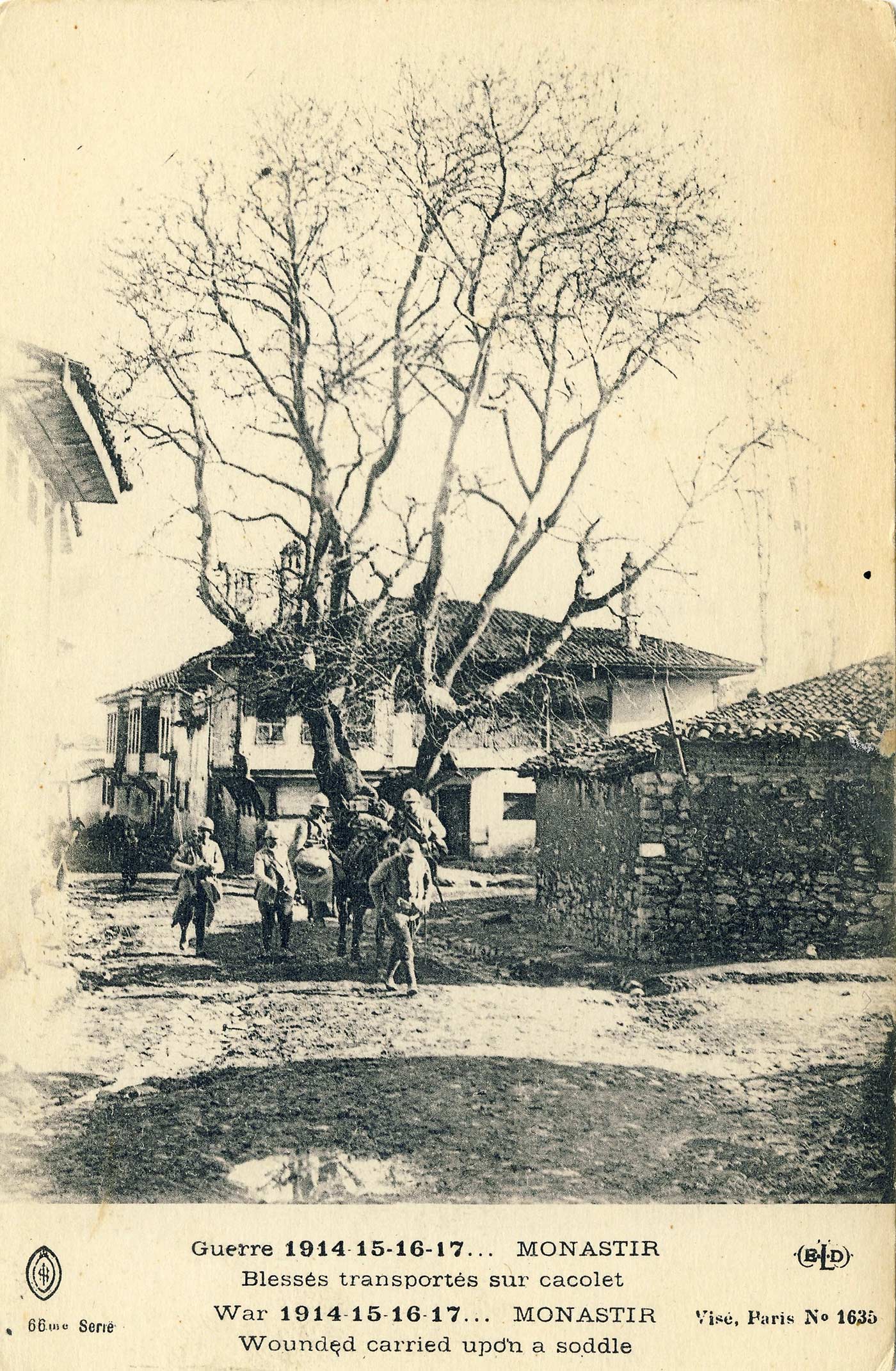 Пренос на ранети во седло 1917 г 256 ОписПренос на ранети во седло. Во заднината се гледа најстарото дрво во градот наречено”Чинар”. Куќата во заднината на оваа слика сé уште постои со мали промени на прозорците.ИздавачErnest Louis Desire Le DeleyДата1917-01-01Временски период3. Прва светска војнаМедиум (материјал)ХартијаДимензии (mm) Висина140 Ширина90 МестоБитола (општина)Геокоординати 41.03286857294457 , 21.33236946278355 Споделете доколку Ви се допаѓа Previous itemКонвој со муниција влегува во градот 1917 г. Next itemРазгледница снимена покрај реката Драгор, издадена 1917
